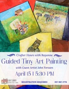 This special session will feature a guided class with guest artist John Forssen. Participants will have the opportunity to paint their own 4”x4” canvas—complete with a miniature wooden easel—while exploring vibrant summer garden themes. This class is designed for adults of all skill levels, and all supplies are provided. Registration is required to attend. Attendees may choose to display their finished artwork in the library’s upcoming Tiny Art Show and pick it up later or take their masterpiece home the same evening. As always, the emphasis is on having fun—remember, it is fun art, not fine art! The Louis T. Graves Memorial Public Library is located at 18 Maine Street, Kennebunkport. For further information or to register, please call 207-967-2778 or visit www.graveslibrary.org.