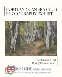 We are thrilled to host the Portland Camera Club here at Graves Library during the month of September.  Please stop by and take some time with the exhibit located in the Business Center.  The Library is located at 18 Maine Street, Kennebunkport.