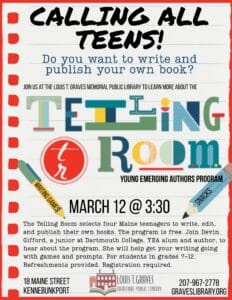 Do you want to write and publish your own book? The Telling Room’s Young Emerging Authors program is a free, paid, 15 month-long writing and publishing program. Every spring, we select four Maine teenagers in grades 8 -12 to write, edit, and publish their own books. Join Devin Gifford, a junior at Dartmouth College, YEA alum and author of “The Unraveling” to hear about the program. She will discuss the process of writing a book, as well as help get your own writing going with games and prompts. This program is for students in grades 7-12, and pre-registration is encouraged. Light refreshments will be provided.